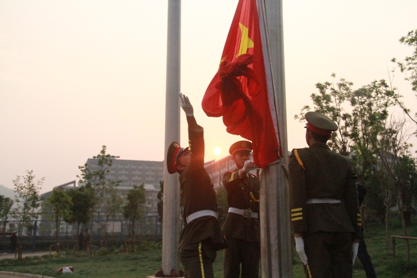 早上7:30,在全体师生的注目礼下,英姿飒爽的国旗护卫队和国旗督察队队员们护送鲜艳的五星红旗进场,伴随着庄严的中华人民共和国国歌,五星红旗冉冉升起。在场的每一个人深怀对祖国无限的热爱和崇高的敬意向国旗行注目礼。