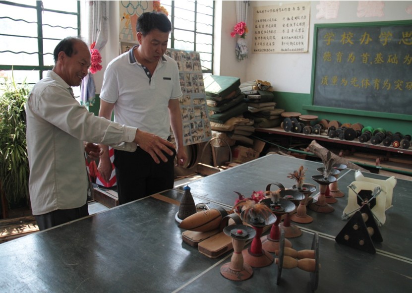 毕老师向吕副经理介绍自己用废弃的材料制作的空竹、橄榄球等。