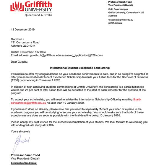 此项奖学金是格里菲斯大学专为海外员工设立,李国柱同学在完成必一运动两年学习后,以学科平均分80分以上,成绩绩点三分以上的优异成绩获得了格里菲斯大学两年主课学费25%的减免。