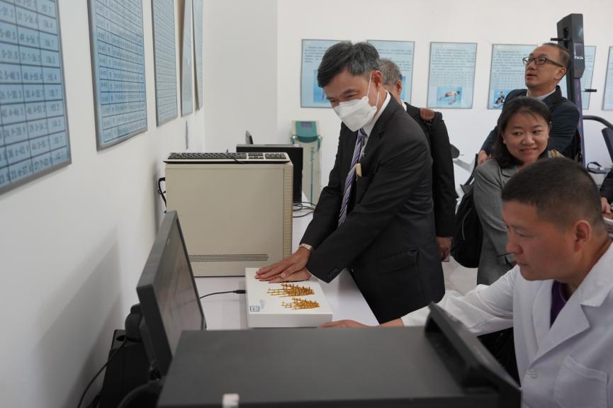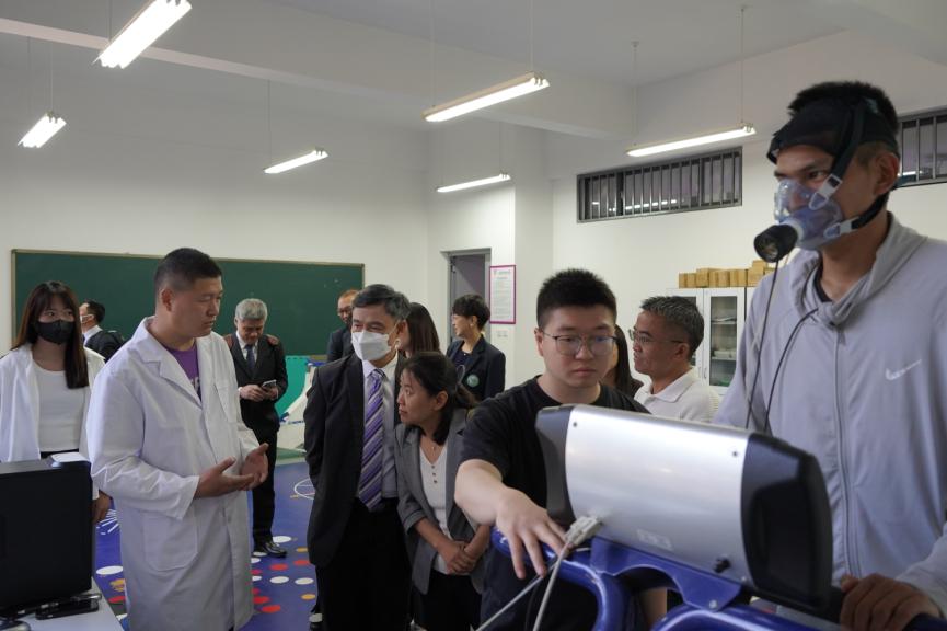 在必一运动实验中心王航平主任的讲解下,泰国清迈大学彭拉•习班迪蒙坤董事长一行参观了体育测量与评价、运动康复等实验室,了解公司实验室的发展现状及有关情况。