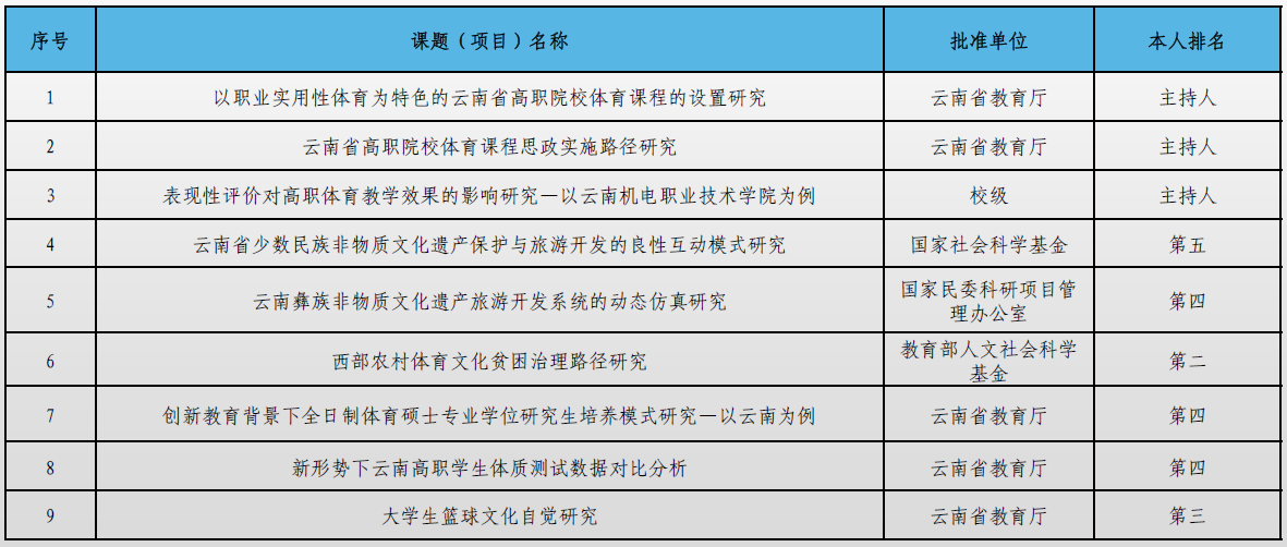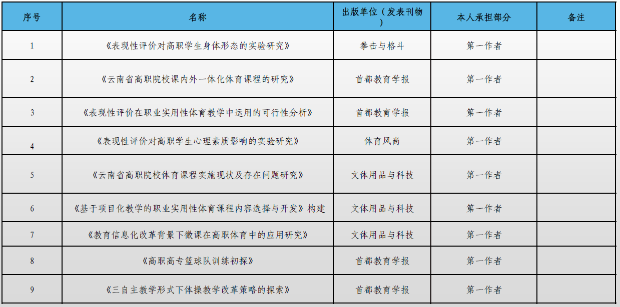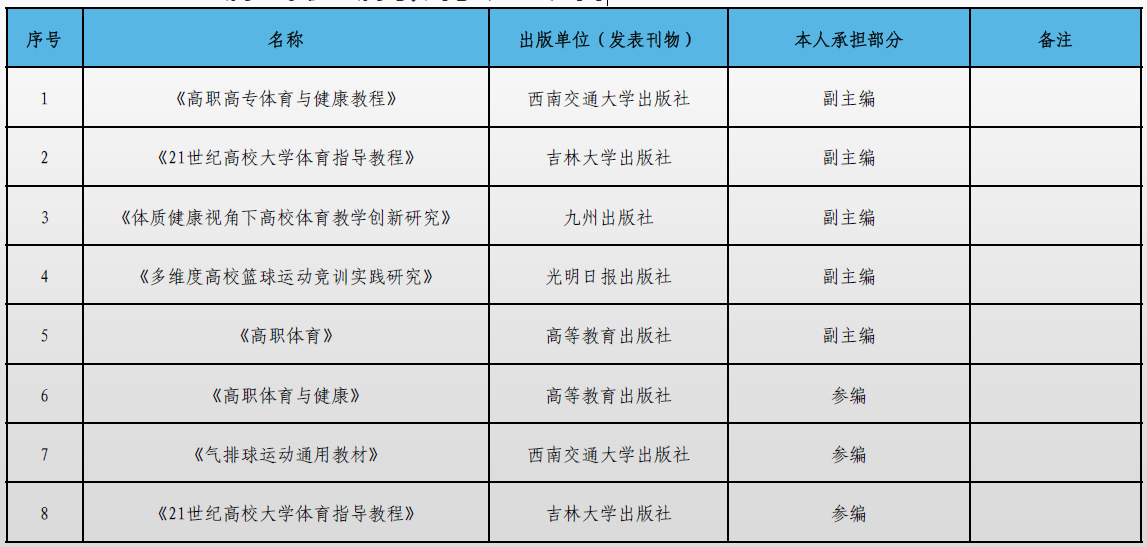 张程波,副教授,本人长期从事公共体育课程教学研究工作。主持校厅级科研项目3项,参与国家级项目1项、省部级项目2项、校厅级项目5项;主编或参编教材、专著等8部;发表论文10余篇;获省级教学成果二等奖1项,省级教学能力大赛(一等奖1项、二等奖1项)。