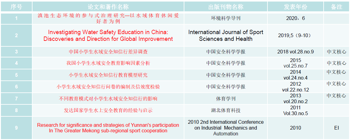 体育心理学、户外教育、青少年水域安全教育、高原河湖水域体育休闲、网球教学与训练、动作技能学习与发展